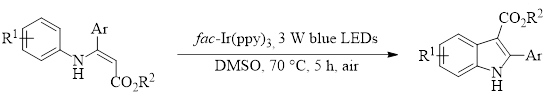 With this in mind, the Wu group has recently published an account of synthesizing indoles using a single photosensitizer [fac-Ir(ppy)3] and blue LED lights to promote a cyclization of easily-prepared enamine substrates in DMSO.1 This reaction produces highly substituted indoles in good to excellent yields (58–99%, 23 examples). Additionally, this reaction requires no special additives or environment and works well when run under air.
