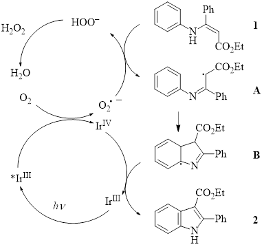 In this mechanism, IrIII is excited by the blue LED light to *IrIII. Oxygen then interacts with the *IrIII species to form the superoxide radical anion. The superoxide radical anion abstracts a hydrogen atom from the enamine starting material 1 to form the radical intermediate A. This intermediate undergoes radical cyclization for produce B. The cyclic intermediate B is then oxidized by the IrIV species to form the indole product 2.